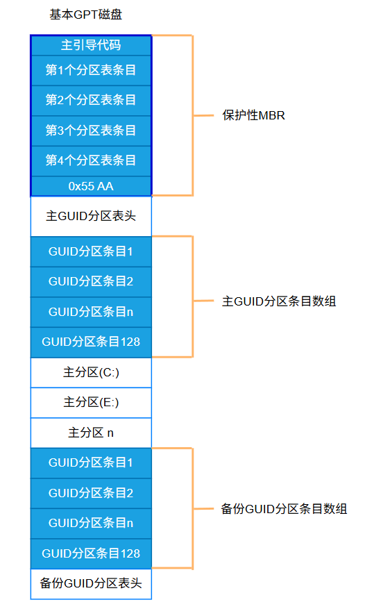 下图展示了基本磁盘的 GPT 分区布局: