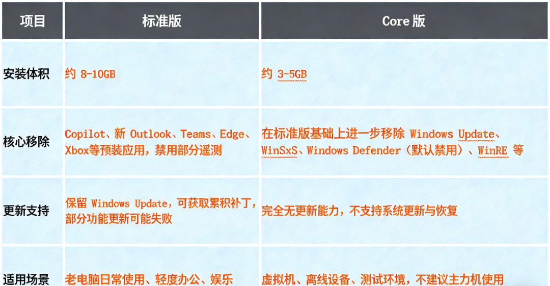 Win11 X-Lite 26H1 与Tiny11 25H2精简版系统谁好用?在如今的数码圈,“轻量化”早已成为众多用户的核心诉求。无论是希望老电脑重获新生的普通用户,还是追求极致游戏性能的硬核玩家,都对原版Windows系统中冗余的预装组件、后台进程感到困扰,而第三方精简版系统的出现,恰好精准击中了这一痛点。近期,Win11 X-Lite 26H1 与 Tiny11 25H2 两款第三方精简版Windows系统更是强势出圈,成为大家热议的焦点——前者以游戏性能优化为核心卖点,宣称能大幅提升帧率、缩短启动时间;后者则凭借亲民的硬件门槛和接近原版的稳定性,收获了大批老设备用户的青睐。 随着两款系统的下载量持续攀升,关于它们的讨论也愈发激烈:有人说Win11 X-Lite 26H1的极致精简让游戏体验翻倍,也有人认为Tiny11 25H2的兼容性更适合日常使用;有人纠结于两者的安全风险差异,也有人关心不同配置设备下的适配表现。那么,这两款火爆的精简版系统到底哪个更值得选?它们在系统占用、性能表现、兼容性、安全性等关键维度上又有怎样的差异?今天,我们就带着这些疑问,为大家带来两者的详细对比,帮你根据自身需求做出最合适的选择。 ![]() Win11 X-Lite 26H1 与 Tiny11 25H2介绍 1、Win11 X-Lite 26H1介绍: Windows X-Lite 是由 NTDEV 团队开发的第三方定制精简版 Windows 系统,主打低资源占用、游戏性能优化与老旧设备适配,基于 Windows 10/11 官方核心深度精简,非微软官方发行Windows X-Lite。 Windows X-Lite团队发布基于Windows 11 26H1的轻量化定制系统,删减非必要组件并优化设置,显著降低内存与磁盘占用。Optimum版面向日常场景,兼顾性能与兼容;Micro及Ultralight版进一步精简服务,仅保留核心,适配旧PC与虚拟机,但删减幅度大,不推荐主力使用。团队宣称镜像“100%安全干净”,因其属第三方修改,安装风险需用户自担。 版本化分: 1、Optimum版本(日常 / 兼容性): 保留核心功能与兼容性,仅精简冗余组件,既能满足3A游戏高性能需求,又能流畅应对办公、直播等日常场景,是兼顾实用与性能的“万金油”。 2、Micro(旧机): 进一步删减非必要系统服务,仅保留最核心的运行模块,适合4GB内存、512GB SSD的老旧设备,最大化释放硬件潜力,让五年前的旧PC重新焕发战斗力。 3、Ultralight( 虚拟机): 极致精简所有非必需功能,仅维持基础系统框架,资源占用最低,专为虚拟机测试、低配主机专用游戏场景设计,不建议作为日常主力系统。 https://windowsxlite.com/downloads/ 网盘分流下载:https://pan.baidu.com/s/1paFkoNAVampk2DHysQ_TCg?pwd=if2q 2、Tiny11 25H2介绍: Tiny11 25H2 是由开发者 NTDEV 基于 Windows 11 25H2 官方镜像打造的第三方精简系统,2025 年 10 月发布,核心优势是突破硬件限制、大幅精简冗余、支持本地账户,分标准版与 Core 版,适配 x64 和 ARM64 设备,适合老电脑与轻量场景。 熟悉 Tiny11 的都知道,这是基于原版 Win 11 精简定制的一个更轻量、纯情、更省心的系统,曾受到无数用户青睐。而 Tiny11 25H2 则基于最新原版 Win 11 25H2 镜像打造。它直接砍掉了大量动不动就跑后台、占用资源、我们可能一辈子都用不上的功能和组件、一堆预装 App 以及各种奇奇怪怪的服务。 版本化分: 1、标准版(标准版):老电脑日常使用、轻度办公、娱乐 约8-10GB,核心移除Copilot、新 Outlook、Teams、Edge、Xbox 等预装应用,禁用部分遥测,保留 Windows Update,可获取累积补丁,部分功能更新可能失败。 2、Core版(极限精简版):虚拟机、离线设备、测试环境,不建议主力机使用 约 3-5GB,在标准版基础上进一步移除 Windows Update、WinSxS、Windows Defender(默认禁用)、WinRE 等,完全无更新能力,不支持系统更新与恢复。 夸克网盘分流下载:https://pan.quark.cn/s/40b67b4a3ece 百度网盘分流下载:https://pan.baidu.com/s/1-nZ0gUEPv1l5YqqS8-9wDw?pwd=hbnf 提取码: hbnf Win11 X-Lite 26H1 VS Tiny11 25H2从多个角度终极对比 Win11 X-Lite 26H1 是基于 Win11 26H1 打造的游戏向精简系统,资源占用更低、游戏优化更强,有多个版本可选;tiny11 25H2 基于 Win11 25H2,主打轻量化与基础兼容性,更新与安全机制保留更完整,适合老设备日常使用。 1、核心基础信息: Win11 X-Lite 26H1:Win11 X-Lite 26H1是由NTDEV团队2026年更新,版本分为:Optimum、Micro、Ultralight三个版本。 Tiny11 25H2:是由NTDEV团队2025年更新,版本分为标准版和Core两个版本。 2、功能精简对比: Win11 X-Lite 26H1是以深度精简系统组件、彻底关闭后台服务为核心手段,专为游戏玩家及高性能场景设计的第三方优化系统,专为与所有应用程序和游戏配合使用而设计,适用于所有电脑。无论新旧、配置高低、台式机还是笔记本电脑。 绕过 TPM、安全启动、内存、CPU 和存储检查,绕过 Microsoft 在安装/设置过程中强制创建帐户。 Tiny11 25H2主要亮点就是精简,开发者将系统里的各种冗余软件删除提高系统的运行效率,并且不需要满足 Windows 11 硬件要求(绕过 TPM 强制要求)和微软账号,这对于老旧 PC 来说也是个福音。 Win11 X-Lite 26H1: •游戏优化:内置智能资源分配引擎,优先分配 CPU 算力给前台游戏,暂停后台服务;预装 DirectX 全版本、VC++ 等运行库,解决游戏组件缺失问题;优化内存压缩和 DirectStorage 解压效率,缩短关卡加载时间。 •精简内容:砍掉 Cortana、Microsoft Store、Windows Defender(可选保留),禁用遥测、广告推送等,后台进程仅 49-62 个,空闲内存占用低至 1.1GB。 •账户与部署:支持离线创建本地账户,跳过微软账号强制登录,全程无需联网,3 分钟完成部署。 Tiny11 25H2