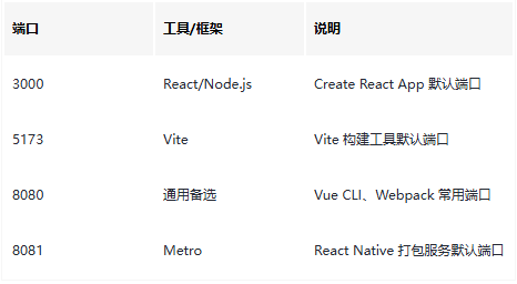 │ └── 常用端口:80(HTTP)、443(HTTPS)、3000(React)、5173(Vite)