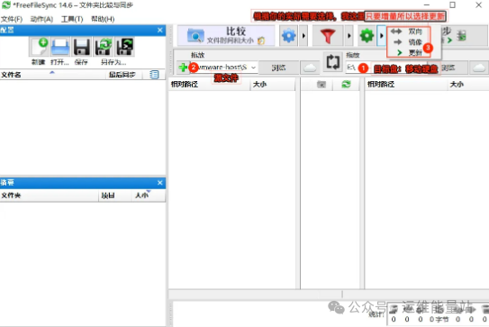 二、基础同步配置1. 打开主程序启动桌面上的 FreeFileSync 程序 2. 选择同步目录