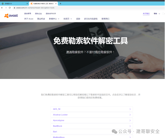 三、了解GRANCRAB勒索病毒通常各大安全厂商有勒索病毒专区,如国际厂商kaspersky、bitdefender、avast、symantec,国内厂商Sangfor、360等 如Avast的 https://www.avast.com/zh-cn/ransomware-decryption-tools