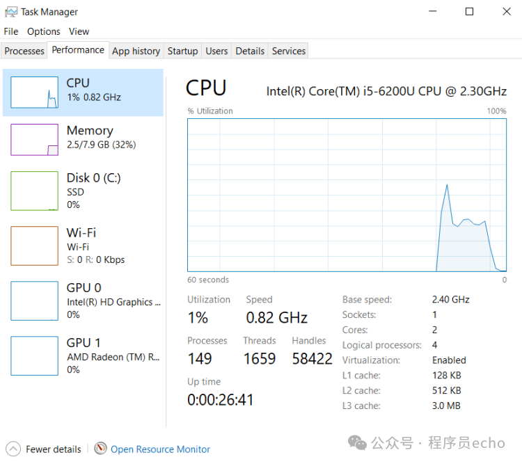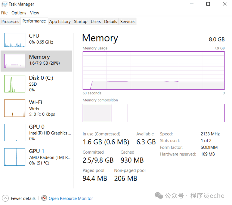 资源占用方面就更有意思了。 Tiny10 在空闲状态下,CPU 使用率基本维持在 1% 左右,内存占用大概 1.6GB;而普通 Windows 10,CPU 虽然也不算夸张,但内存常年在 2.5GB 以上,差距非常稳定。