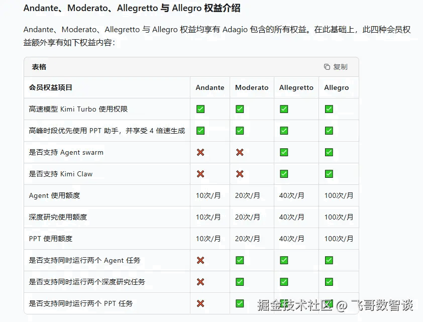 另外就是有非官方反馈,Kimi 非指定工具使用可能封号,并且仅限个人使用,禁止企业使用。 结语一圈看下来,我还是选择了 MiniMax,各档内容清晰明确,并且性价比比较高。不过为了体验原生多模态的区别和 Agent 集群效果,我也订阅了一个月的 Kimi,等我实测一波,再来和大家汇报区别。 参考文章:原文链接 该文章在 2026/3/2 11:28:54 编辑过 |