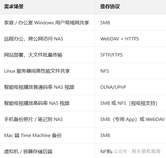 配置建议 仅需媒体播放时单独开启,无需搭配其他文件共享协议; 将不同类型媒体文件分类存放,提升设备扫描和识别效率; 播放高码率视频时,建议搭配 SMB/NFS 协议,放弃 DLNA/UPnP。 考使用搭配建议家庭纯局域网场景:主开启 SMB,搭配 DLNA/UPnP 满足电视播放需求 需远程访问的家庭 / 小型办公场景:局域网用 SMB,公网开启 ;WebDAV+HTTPS,配合内网穿透和双因素认证; 企业 / 技术开发场景:Linux 服务器 / 虚拟化用 NFS,建站 / 大文件传输用 SFTP/FTPS,Windows 客户端用 SMB; 纯媒体播放场景:仅开启 DLNA/UPnP,高码率视频需求叠加 NFS; 多设备跨平台同步场景:主用 WebDAV,搭配各设备专用同步 App。