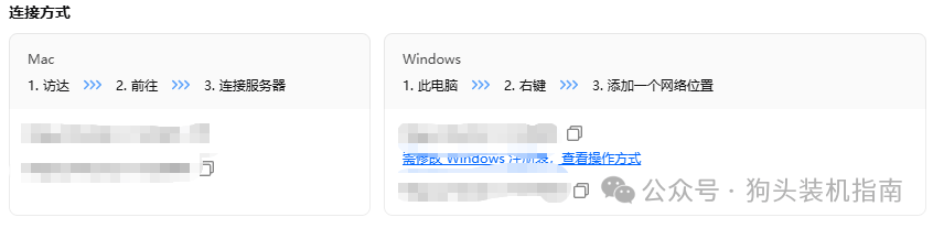 一、SMB(Server Message Block)最推荐的日常局域网文件共享协议,微软开发,目前为 NAS 主流协议,Linux 可通过 Samba 实现支持。 优势劣势Linux 原生不支持,需额外安装 Samba 组件; 协议开销较大,跨公网 / 跨网段访问性能差、配置麻烦; 老旧版本(SMB1.0)存在勒索病毒等安全风险。 适合家庭多设备日常文件共享、媒体播放; 办公室 Windows/Mac 混合环境文件协作; Mac 端 Time Machine 备份 NAS; 智能电视 / 盒子直接播放 NAS 视频。 使用方式Windows:文件资源管理器地址栏输入 \NAS_IP\ 共享名; macOS:Finder→前往→连接服务器,输入 smb://NAS_IP/ 共享名; Linux:执行命令 mount -t cifs //NAS_IP/ 共享名 /mnt/point -o username=xxx; Android/iOS:通过 Solid Explorer、FE File、Explorer 等文件管理器添加 SMB 服务器。