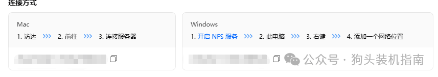 配置建议公网环境禁止使用纯 FTP,务必启用 FTPS 或改用 SFTP; 多人共用 NAS 时,通过带宽控制为不同用户分配传输速度; 仅对公开资源开启匿名访问,敏感文件需关闭并设置独立账号密码; 配置时限制 FTP 用户的访问目录,避免跨目录访问泄露数据。 四、NFS(Network File System)Sun Microsystems 开发,Unix/Linux 系统标准网络文件系统协议,高性能场景首选 优势劣势Windows 支持性差:仅专业版及以上版本支持 NFS 客户端,配置繁琐; 易出现中文文件名乱码问题,Windows 端需额外工具解决; 权限管理简单:默认无加密传输,主要依赖 IP 地址认证,灵活性低于 SMB; 配置复杂,需手动设置 exports、UID/GID 映射等参数。 适合Linux 服务器 / 主机之间的高性能文件共享; PVE、ESXi、Docker 等虚拟机 / 容器的存储后端; 高阶安卓电视盒 / Kodi 播放高码率原盘电影; macOS 端大文件高速读写。 使用方式Linux/macOS:执行 sudo mount -t nfs NAS_IP:/export/path/mnt/nfs 命令,或在 /etc/fstab 中添加项实现开机自动挂载; Windows:先在「启用或关闭 Windows 功能」中勾选 NFS 客户端,再映射网络驱动器・NAS 端:开启 NFS 服务,配置允许访问的 IP 地址及对应权限。