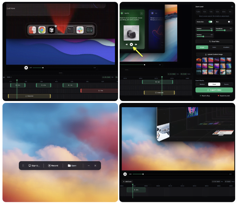 1️⃣ 录屏功能支持全屏录制和特定应用录制,实时预览,录制清晰度优秀。无论你是做产品演示、软件教程还是游戏录制,都能满足基本需求。 2️⃣ 缩放效果这是 OpenScreen 的核心亮点之一!