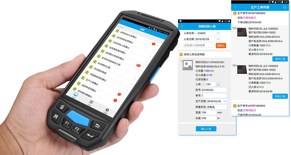点晴模切ERP的最大亮点之一是移动扫码解决方案。系统从原材料入库到领料、成品入库到出库、用料用工汇报、IQC来料品检到FQC成品终检的全过程,都可通过手机或手持终端扫码完成。