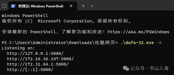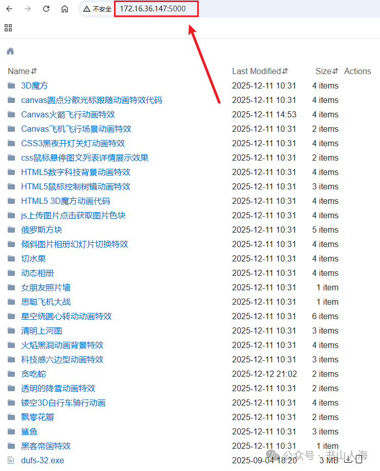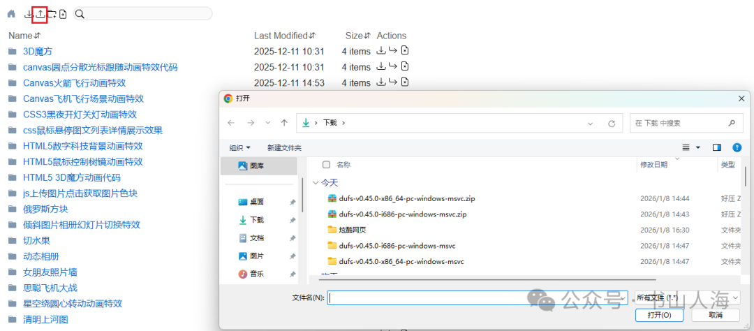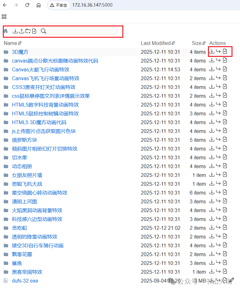 推荐了一款特别小众小巧并且功能强大的软件Dufs,下面我们一起来看一下这款软件具体使用吧! 软件介绍该软件托管在github上,是一款开源的工具,地址如下: Dufs的Github主页:https://github.com/sigoden/dufsDufs下载页面 :https://github.com/sigoden/dufs/releases 有博客专门为这个软件写了一篇介绍的文章,提到了“Dufs一款非常小巧且功能强大的文件服务器,你可以用它搭建文件服务器,它可以用于静态文件服务、文件上传、搜索、访问控制以及WebDAV等功能。” 感兴趣的朋友们可以看一下:https://www.iewb.net/content/html/78.html 由于访问该软件的github下载地址常常会因为网络问题而访问失败,故作者将其Windows版本的下载后存放于网盘,以方便大家下载。其他版本例如MacOS以及Liunx版本的可以到git上下载。 github下载地址:https://github.com/sigoden/dufs/releases 蓝奏云盘下载地址: 64位版本https://datastrong.lanzoue.com/iZjw43fl1uab 密码:e7zq 32位版本https://datastrong.lanzoue.com/iNOZR3fl1ubc 密码:b7xj 从git上下载的对应的是: 1. 点击下载好的软件就可以了,不需要安装。 打开后就有对应访问的地址,可以复制到浏览器打开。 这里要注意,在哪里打开的文件,默认分享的就是当前文件夹。 2. 软件可以移动到需要分享的文件夹下打开。如果需要添加其他权限可以将该软件放在系统环境变量的目录下,添加一个系统变量后直接使用命令行工具进行操作。 或者在软件目录下打开Windows命令行工具,输入.\dufs-32.exe -A 即可,具体使用方法在后续。 目前该软件支持的操作有: -A(--allow-all):允许所有操作 --allow-upload:允许上传 --allow-delete:允许删除 --allow-search:允许搜索 --allow-symlink:允许链接 --enable-cors:允许跨域 --render-index:允许渲染index.html,如果没有index.html返回404 --render-try-index:允许渲染index.html,如果没有index.html则展示文件夹内容 --render-spa:渲染单页应用 --tls-cert:https证书cert路径 --tls-key:https证书key路径 1. 将该软件移动或者复制到需要分享的文件夹下。 2. 双击打开软件,默认弹出了Windows的命令行的黑色窗口,注意:在分享的过程中不能关闭这个窗口,否则将无法访问。 第一个和最后一个地址都是本机浏览器访问的地址。 第二个地址是同一个局域网内其他主机浏览器访问的地址,也就是可以分享他人的地址。 3. 在需要访问该服务器的主机上打开浏览器,输入软件运行后的命令行窗口的第二个局域网的地址即可访问。 若需要给文件服务器添加其他权限,例如上传等,可以在命令行窗口进行操作。 1. 将下载的dufs复制到需要分享的文件地址下,在当前文件路径下【单击鼠标右键】,点击【在终端中打开】 2. 在打开的终端中输入以下命令。 3. 该命令意思是允许所有操作,在其他主机浏览器中打开如下。 可以发现确实多了很多功能,例如可以点击下载,这个下载是指将整个文件夹打包成zip格式一次性全部下载下来。 可以点击上传按钮,打开了选择窗口,选择任意文件上传到服务器。 除了基本的上传和下载之外,还有新建文件夹,新建文件以及搜索文件。其中新建文件提供了文件编辑界面,可以输入和编辑以及保存文件内容。 文件后面的三个按钮分别是下载,移动以及删除文件。 阅读原文:原文链接 该文章在 2026/3/9 11:02:56 编辑过 |