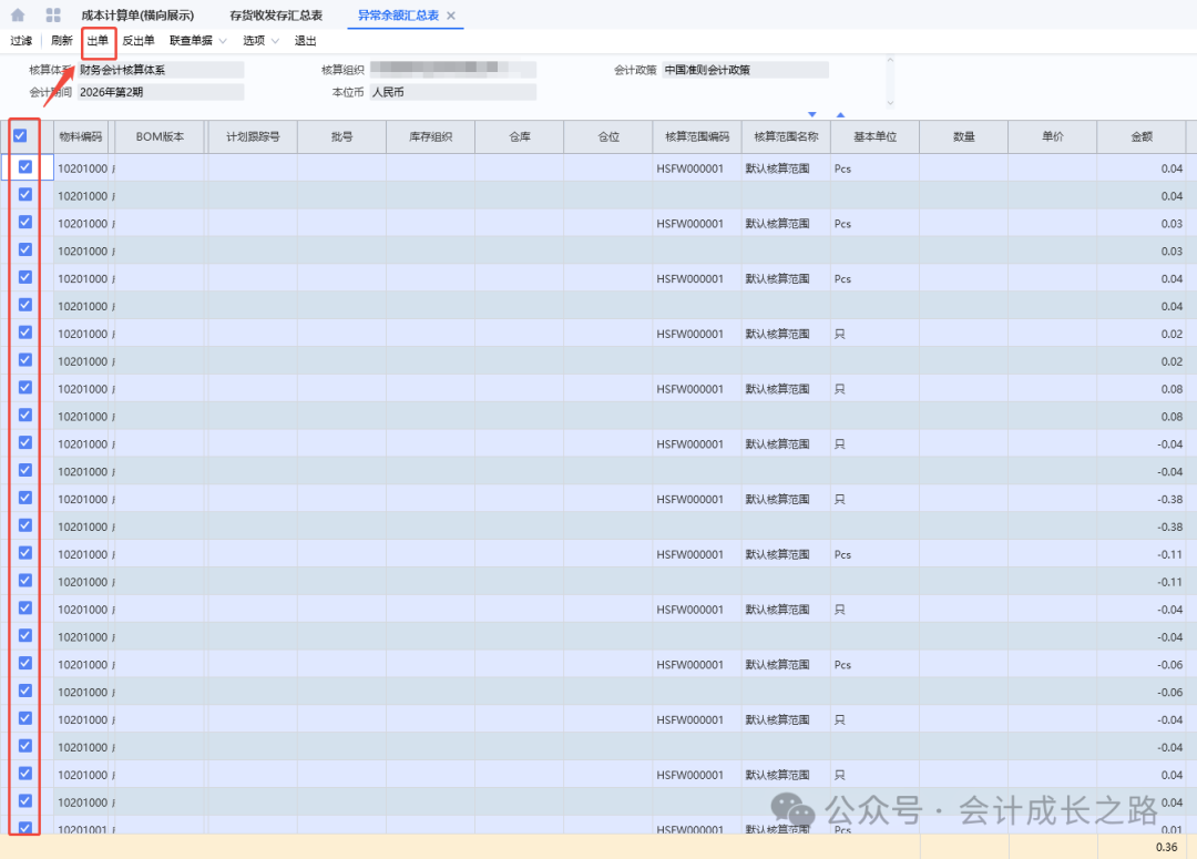 根据明细处理,存货核算期末关账-反关账,处理完上图问题再关账。重新做出库核算,查看合法性检查报告,检查警告项对应明细,如果是供应商免费赠品导致单价等于0,忽略。