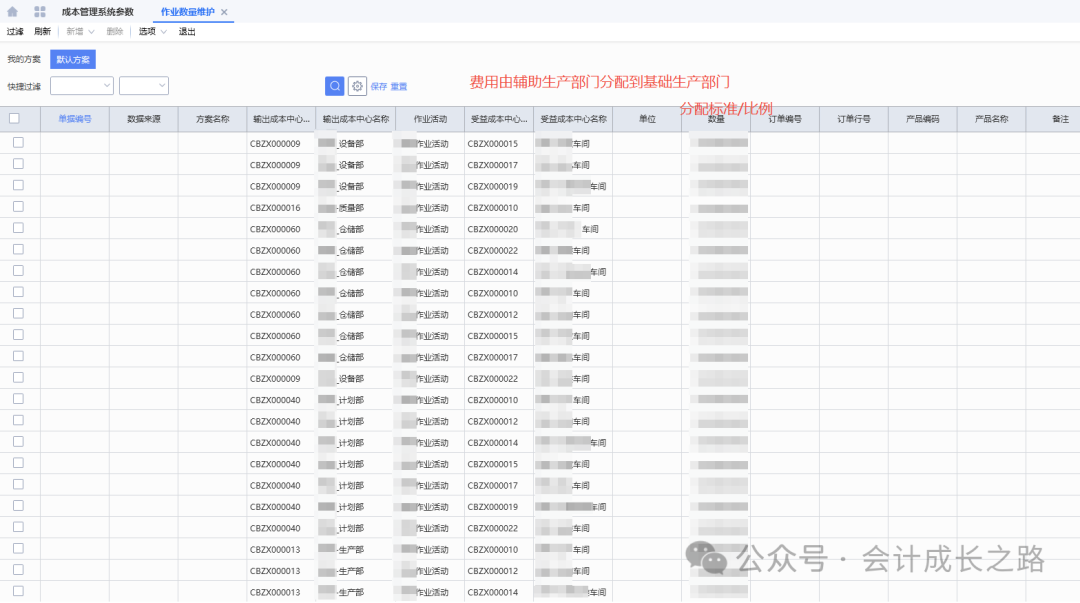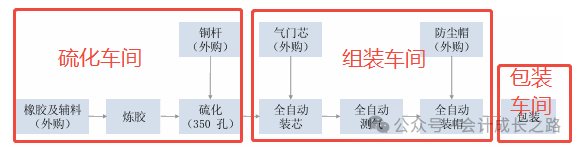 根据组织架构来设置部门:总经办、人事部、财务部、销售部、采购部、质量部、技术部、研发部、仓储部、生产部、各生产部门(根据工序、是否委外、是否需要入库,工期长短、物理位置等因素确定)。例如以下工序分成本中心(工序数据来自保隆汽车股票招股说明书):外购件经过自动线产线组装产品,设置一个传感器车间即可。3、成本中心根据属性(辅助生产、基本生产)关联部门。比较常用的有工时分配(机器工时、人工实际工时、标准工时)、定额分配、完工入库数分配;根据公司特征选用。- 机器工时:自动化高、设备贵、折旧多,费用主要跟机器有关。