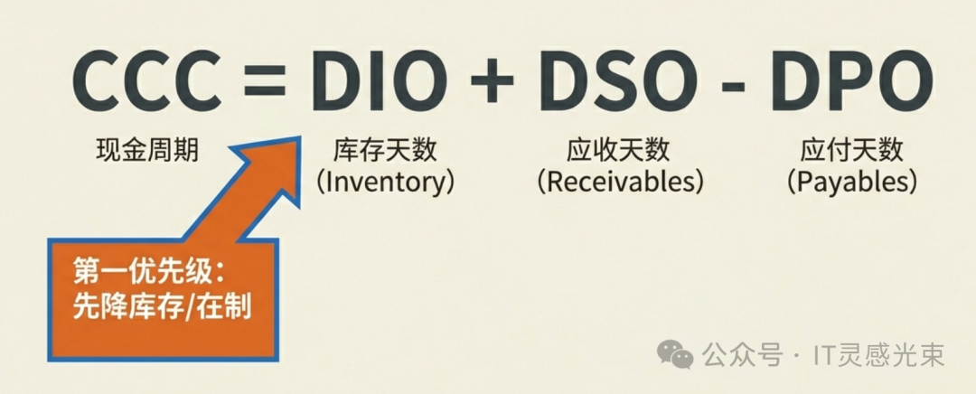 公式: CCC = DIO + DSO - DPO 实操方法(常见顺序):