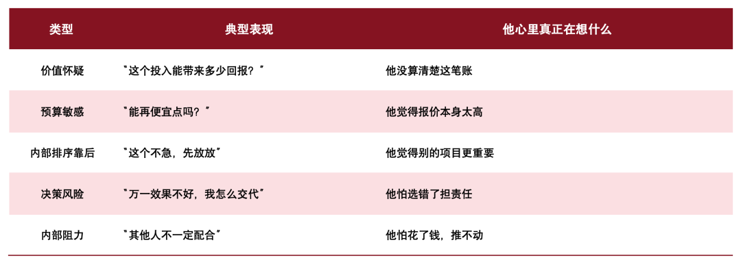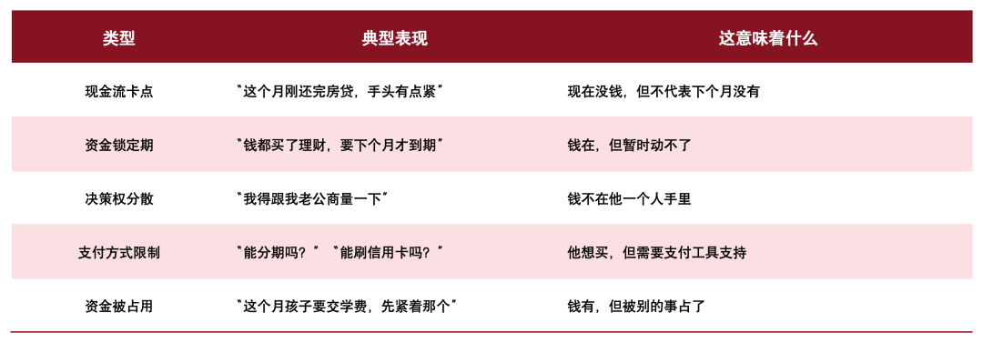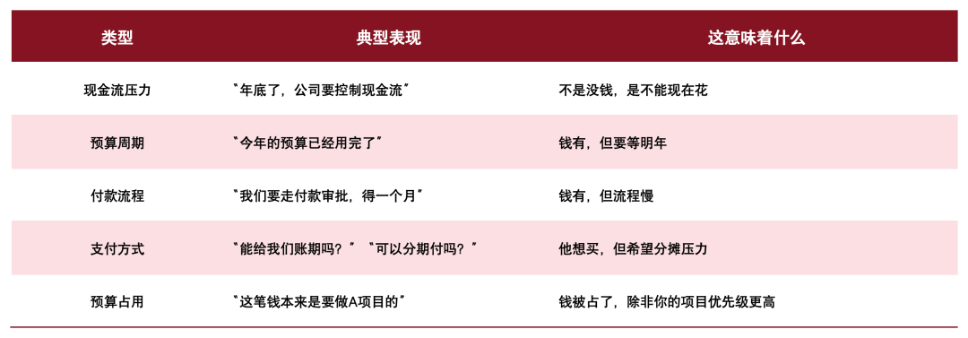 如果他开始聊现金流、预算周期、付款流程——这是卡在“账上”。