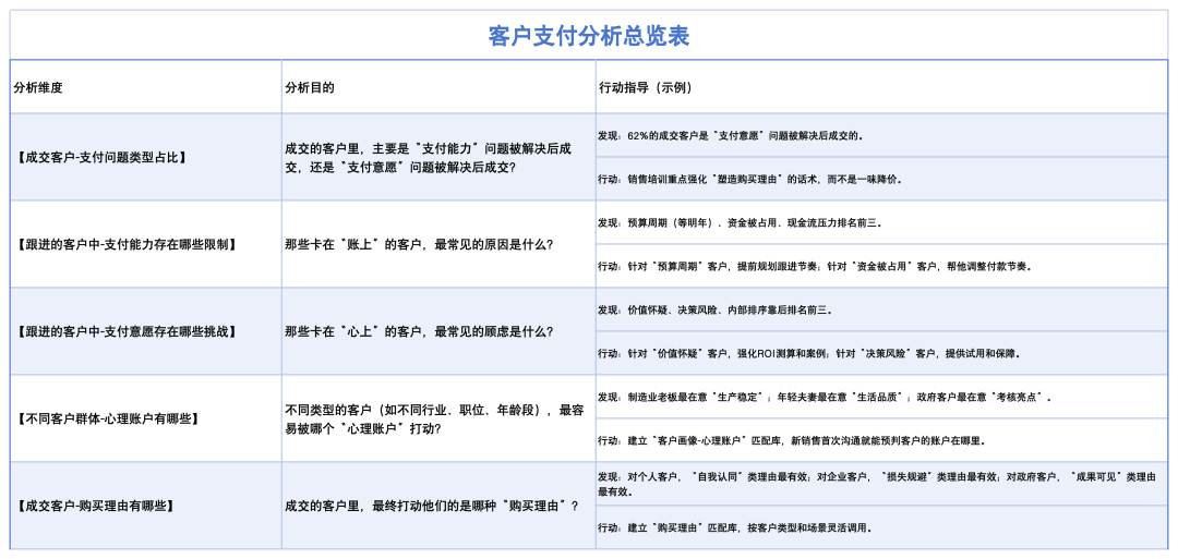 你可以根据下面这几张表,试着分析几个最近几个明明需求都已经确定,但是报价死的客户,看看他们到底是被当前的支付能力困住了,还是被支付意愿并没有那么高...