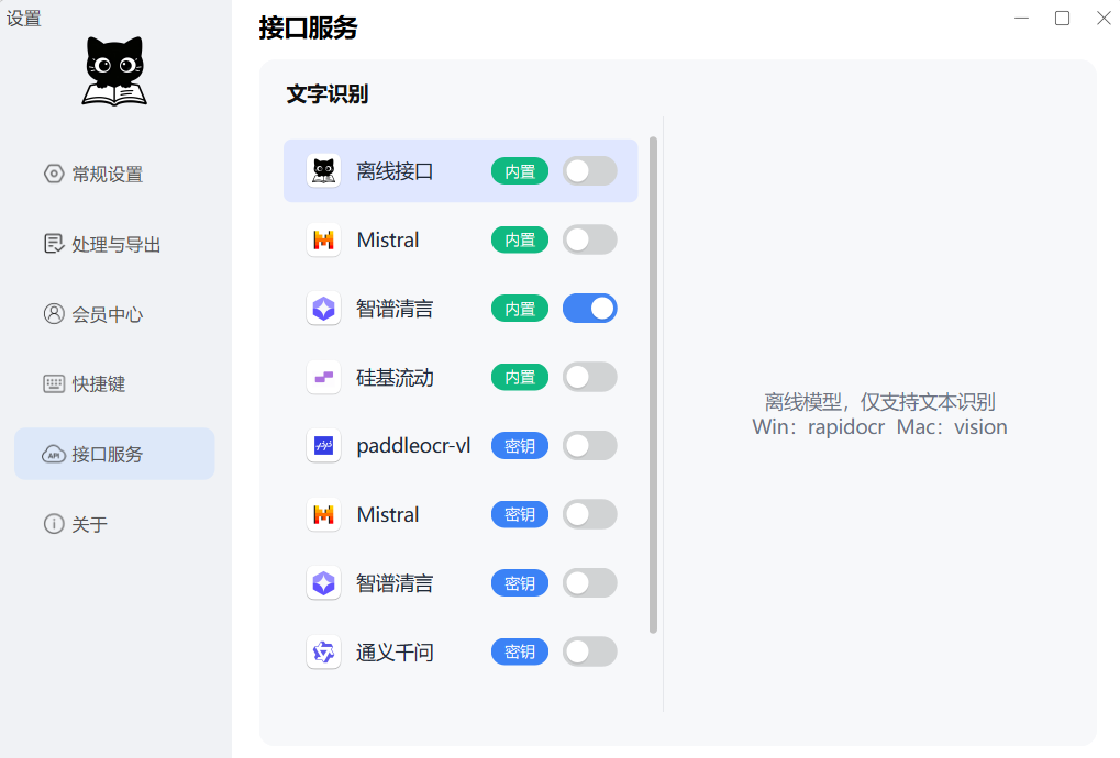 打开软件后,首先进入设置选项,在接口服务中可以选择不同的AI大模型进行图片内容识别,这里内置了4款模型,并且支持离线接口。