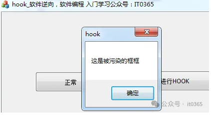 这表明程序已被顺利 HOOK。HOOK 技术,本质上就是对程序原有的内容进行变更,或是增添全新的内容。在此,为了便于直观地演示 HOOK 技术,我们直接在同一个程序中编写代码。倘若针对的是其他进程,我们可以编写一个动态链接库(DLL),待注入操作成功之后,同样能够达成这般效果。