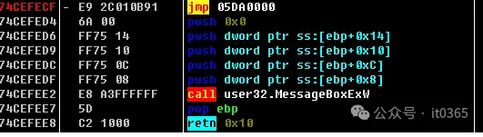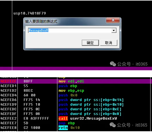 74CEFEE2    E8 A3FFFFFF     call user32.MessageBoxExW