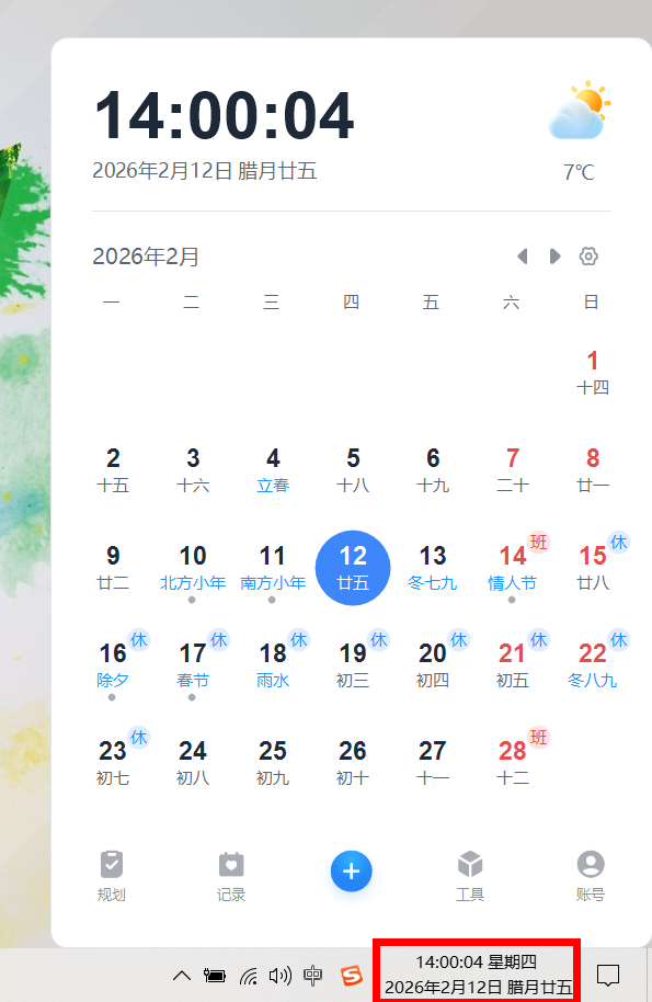 2、打开后,点击右下角的时间,会自动弹出本月日历。上面会详细标注休息日、调休、年节等信息。3、鼠标放在天气上,会自动弹出近期的天气。4、点击设置按钮,可以设置是否开机运行,是否显示农历、节日等信息。5、还可以根据喜好设置时钟样...