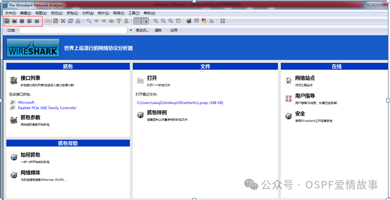 Wireshark的使用比较灵活,打开wireshark后可以看到一个完整的开始界面,如下:Wireshark工具栏1.1、选取抓包网卡在开始之前需要确定要在哪个网卡接口上抓包,有两种方式:1)、可以在首页中的“接口列表”选择2)、在快捷工具栏中点击红色框中的第一个按钮选择网卡接口。选择工作网卡界面如下图:1.2、设置...