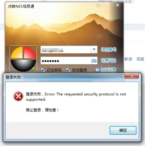 登录点晴MIS信息通PC客户端时提示错误:Therequestedsecurityprotocolisnotsupported.禁止登录,请检查。如何解决?