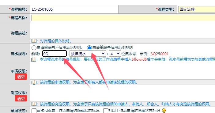 请问新建工作流申请时如何设置根据所在部门自动生成编号?点晴OA工作流流程设计中提供了自定义工作流申请编号功能:在上面的工作流申请单号编码规则中,必须将申请前缀(也即所在部门简称)固定,不能根据申请人所在部门自动变更。