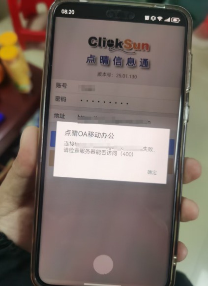 登录点晴手机APP提示错误:连接网站失败,请检查服务器能否访问(400),如何解决?
