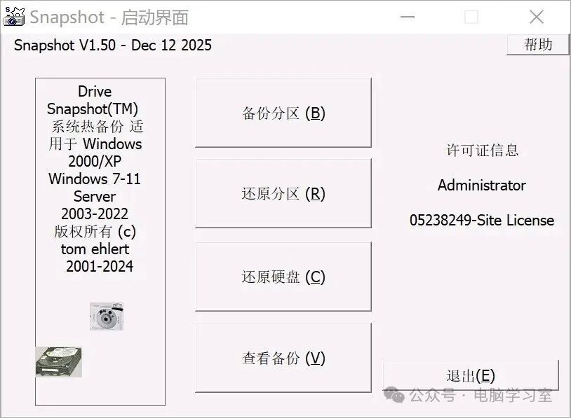 今天给分享一款小巧强大的系统备份还原软件--DriveSnapShot,v1.50.0.1803新版本(2025.12.12)。大小仅3MB,中文绿色便携版~支持Windows2000/XP,Windows7-11,Server2003-2022。支持磁盘卷热备份还原,差异备份,增量备份,异机还原,远程备份,RAID磁...