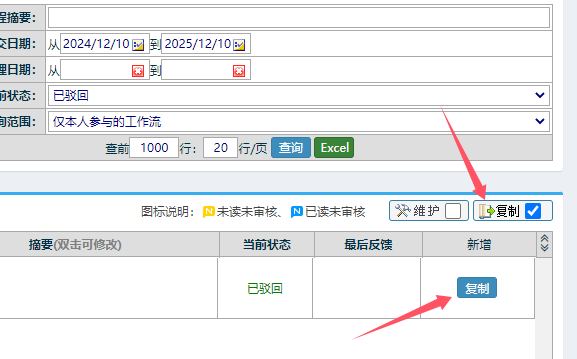 工作流驳回到申请人,能否再原基础上修改后继续提交?在工作流列表页面,勾选右上角“复制”按钮,就会看到有一列新增,后面有一个“复制”按钮,点击就可以在原基础上继续提交了。