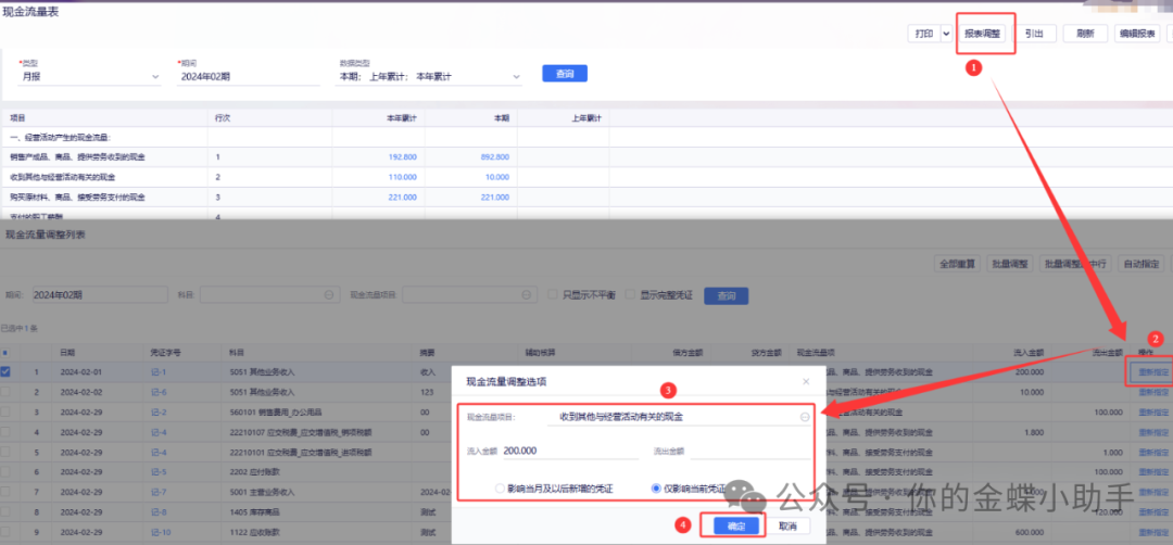 首先现金流量表取的是凭证中有涉及现金及现金等价物科目的数据,保存后即可生成现金流量表。若发现数据不对按以下步骤:1)数据...