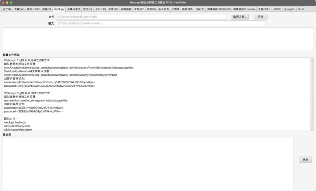 一、工具介绍DecryptTools是一款面向渗透测试和后渗透阶段设计的综合加解密工具,其核心功能在于快速解密各类系统加密数据(如数据库连接字符串、用户凭证等),同时支持AES、RSA、SM4等多种加密算法及逆向提取的专有加解密逻辑。该工具覆盖了20余种主流OA系统,包括万户OA、用友NC、金蝶云星空、致远OA、海康威...