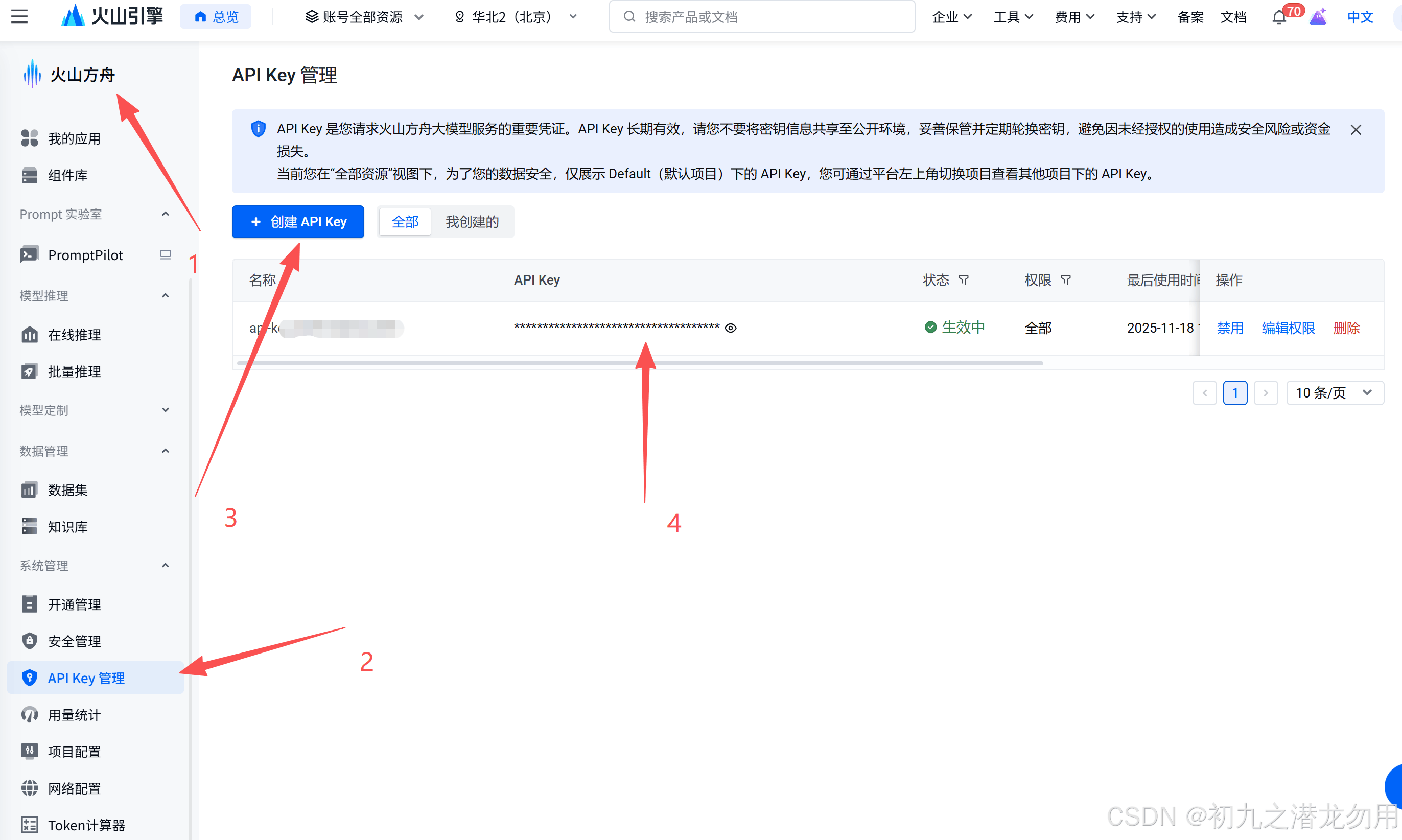 选择火山方舟 -> API Key 管理 -> 创建 API Key 即可,请注意编辑权限以保证能够调用对应功能的 API 。