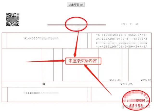 看上去加载正常的 pdf 文档 似乎没啥大问题,来试试加载 pdf 发票 看看,但由于实际发票敏感信息较多,这里就不贴出原本的发票内容,直接来看预览后的发票内容: