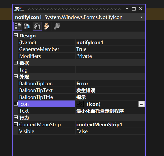 // ContextMenu 属性设置当右键点击系统托盘图标时显示的菜单。