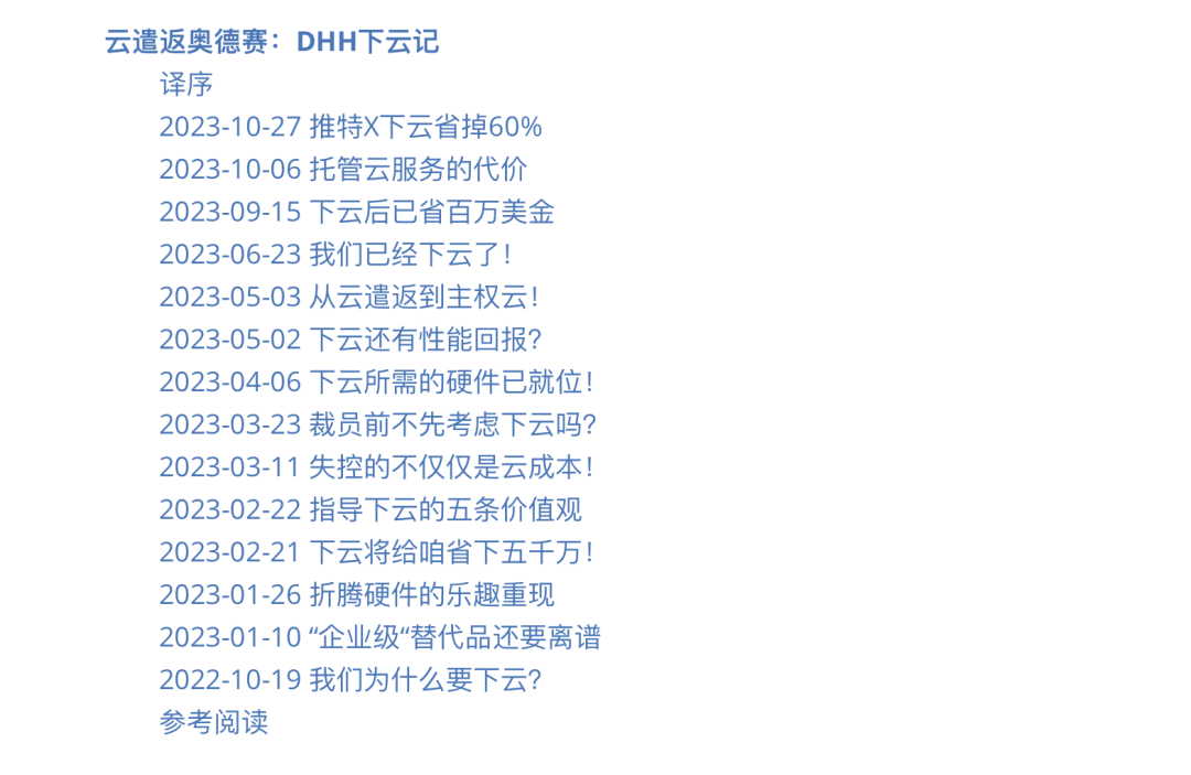 作者:David Heinemeier Hansson,网名 DHH,37 Signal 联创与CTO,Ruby on Rails 作者,下云倡导者、实践者、领跑者。反击科技巨头垄断的先锋。博客:https://world.hey.com/dhh 译者:冯若航,网名 Vonng。磐吉云数创始人,PostgreSQL 专家与布道师,RDS 下云实践者。开源 RDS PG 替代 —— Pigsty 作者,著有《用数据解构公有云 —— 云计算泥石流系列》 译序世人常道云上好,托管服务烦恼少。 我言云乃杀猪盘,溢价百倍实厚颜。 赛博地主搞垄断,坐地起价剥血汗。 运维外包嫖开源,租赁电脑炒概念。 世人皆趋云上游,不觉开销似水流。 云租天价难为持,开源自建更稳实。 下云先锋大卫王,引领潮流把枪扛。 不畏浮云遮望眼,只缘身在最前锋。 曾几何时,“上云“近乎成为技术圈的政治正确,整整一代应用开发者的视野被云遮蔽。DHH 以及像我这样的人愿意成为这个质疑者,用实打实的数据与亲身经历,讲清楚公有云租赁模式的陷阱。 很多开发者并没有意识到,底层硬件已经出现了翻天覆地的变化,性能与成本以指数方式增长与降低。许多习以为常的工作假设都已经被打破,无数利弊权衡与架构方案值得重新思索与设计。 我们认为,公有云有其存在意义 —— 对于那些非常早期、或两年后不复存在的公司,对于那些完全不在乎花钱、或者真正有着极端大起大落的不规则负载的公司来说,对于那些需要出海合规,CDN等服务的公司来说,公有云仍然是非常值得考虑的服务选项。 然而对绝大多数已经发展起来,有一定规模的公司来说,如果能在几年内摊销资产,你真的应该认真重新审视一下这股云热潮。好处被大大夸张了 —— 在云上跑东西通常和你自己弄一样复杂,却贵得离谱,我真诚建议您好好算一下账。 最近十年间,硬件以摩尔定律的速度持续演进,IDC2.0与资源云提供了公有云资源的物美价廉替代,开源软件与开源管控调度软件的出现,更是让自建的能力变得唾手可及 —— 下云自建,在成本,性能,与安全自主可控上都会有非常显著的回报。 我们提倡下云理念,并提供了实践的路径与切实可用的自建替代品 —— 我们将为认同这一结论的追随者提前铺设好意识形态与技术上的道路。 不为别的,只是期望所有用户都能拥有自己的数字家园,而不是从科技巨头云领主那里租用农场。这也是一场对互联网集中化与反击赛博地主垄断收租的运动,让互联网 —— 这个美丽的自由避风港与理想乡可以走得更长。