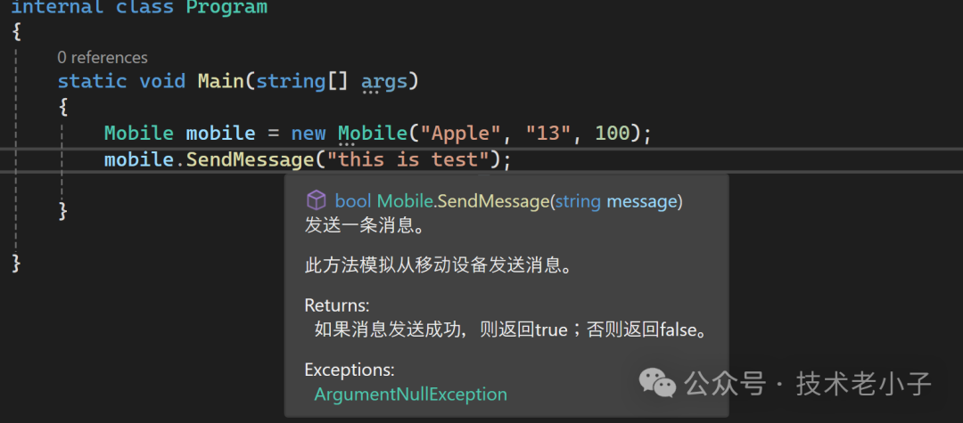 /// <summary>/// 发送一条消息。/// </summary>/// <param name="message">要发送的消息。</param>/// <returns>如果消息发送成功,则返回true;否则返回false。</returns>/// <exception cref="ArgumentNullException">当消息为空或空字符串时抛出。</exception>/// <example>/// <code>/// Mobile mobile= new Mobile("Apple", "13", 50);/// bool result = mobile.SendMessage("Hello, World!");/// </code>/// </example>/// <remarks>/// 此方法模拟从移动设备发送消息。/// </remarks>/// <seealso cref="SendEmail(string)"/>public bool SendMessage(string message){    if (string.IsNullOrEmpty(message))    {        throw new ArgumentNullException(nameof(message), "消息不能为空或空字符串。");    }    // 模拟发送消息    return true;}