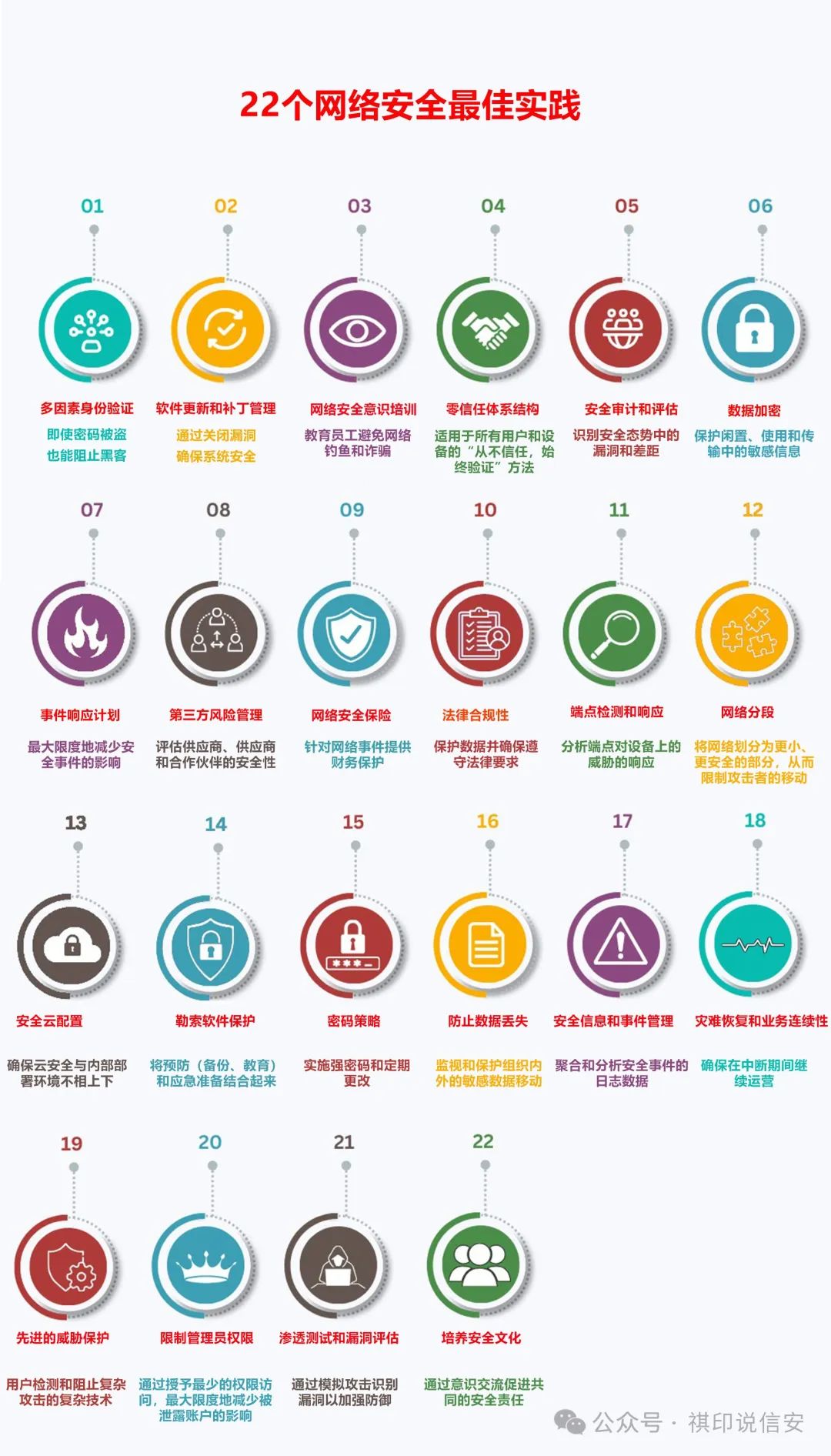 以下是需要牢记的22个网络安全最佳实践要点: 1. 多重身份验证2. 软件更新和补丁管理3.网络安全意识培训4. 零信任架构