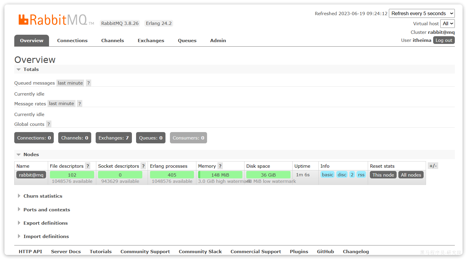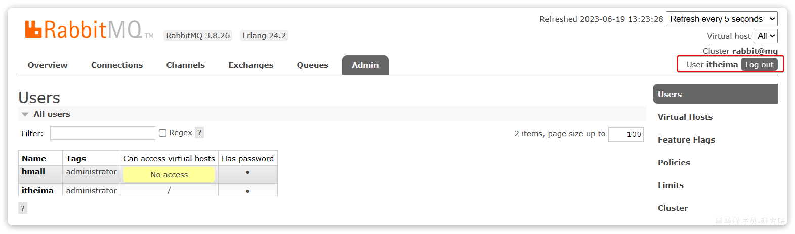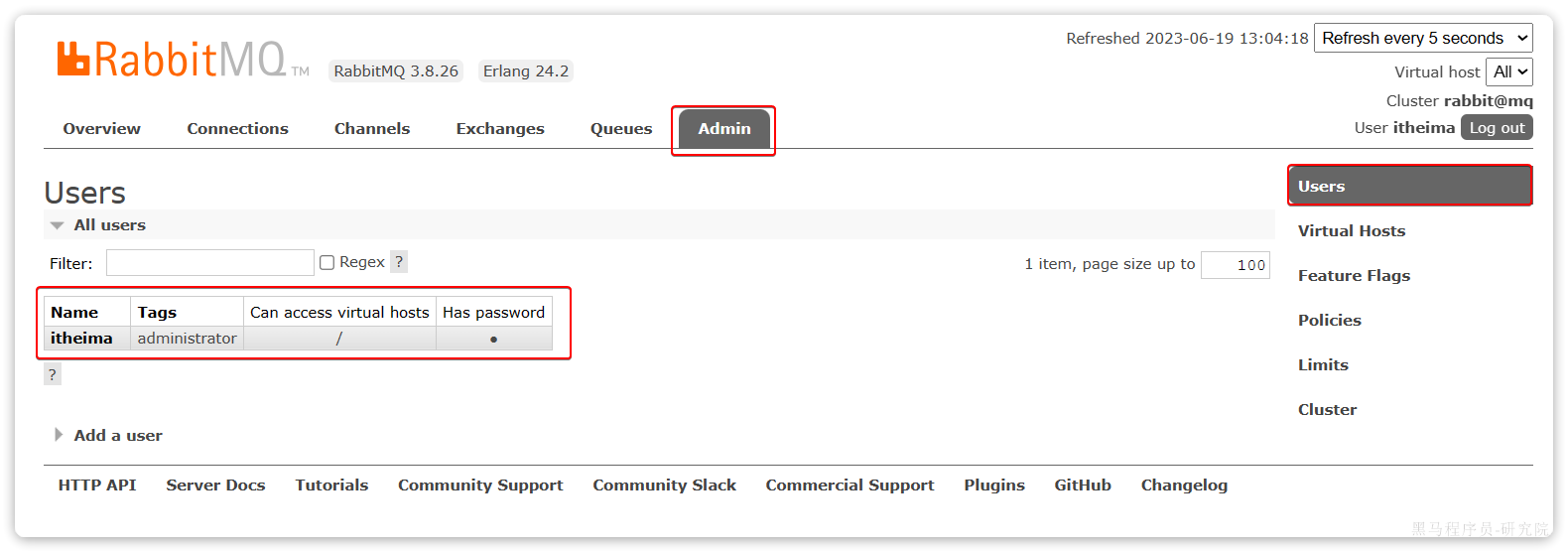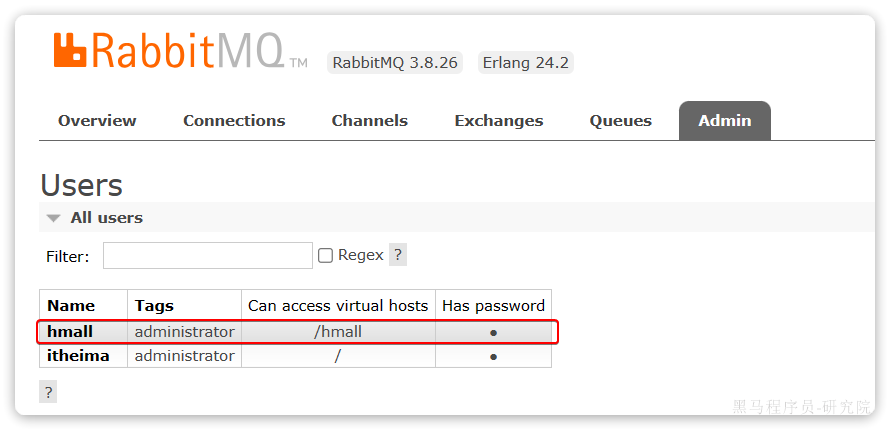 Name:itheima,也就是用户名Tags:administrator,说明itheima用户是超级管理员,拥有所有权限Can access virtual host: /,可以访问的virtual host,这里的/是默认的virtual host