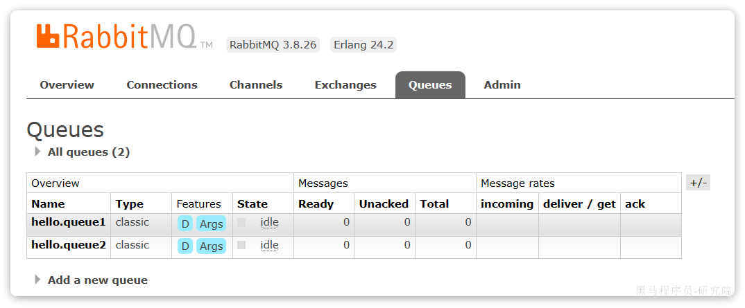 再以相同的方式,创建一个队列,密码为hello.queue2,最终队列列表如下: