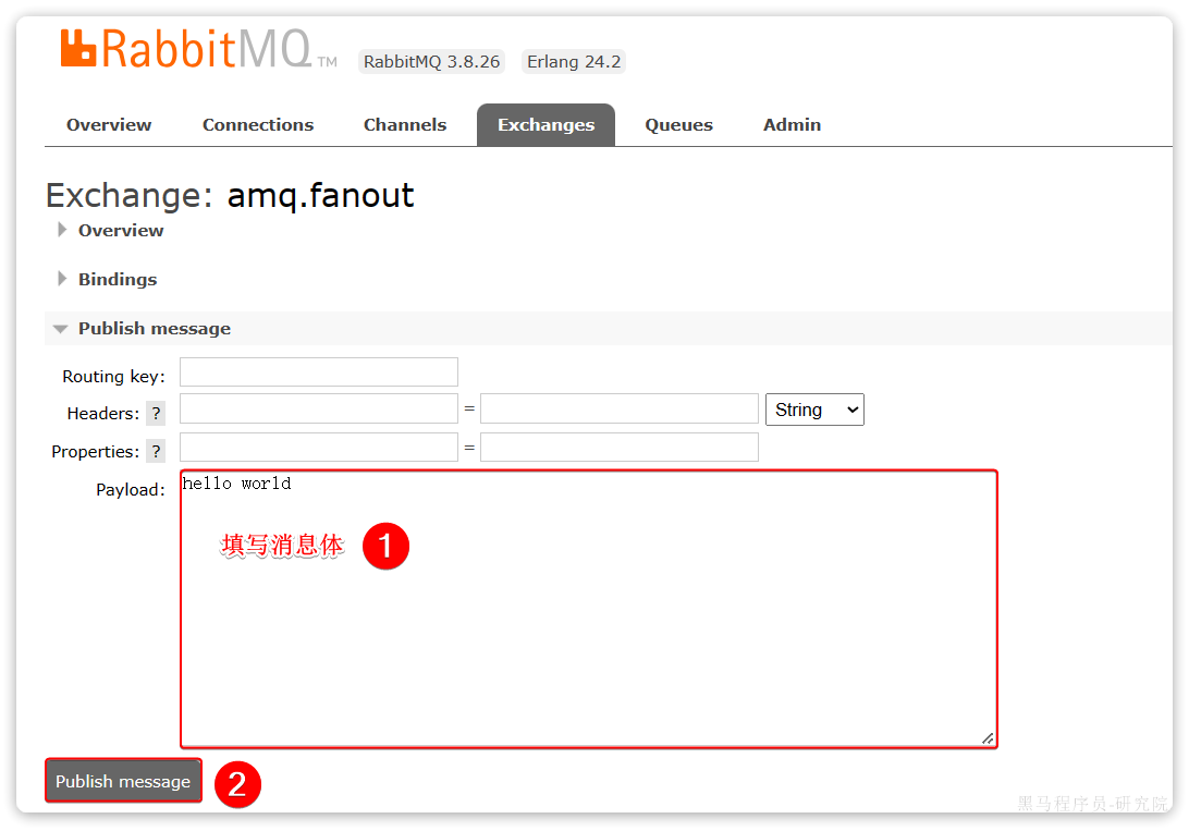 再次回到exchange页面,找到刚刚绑定的amq.fanout,点击进入详情页,再次发送一条消息: