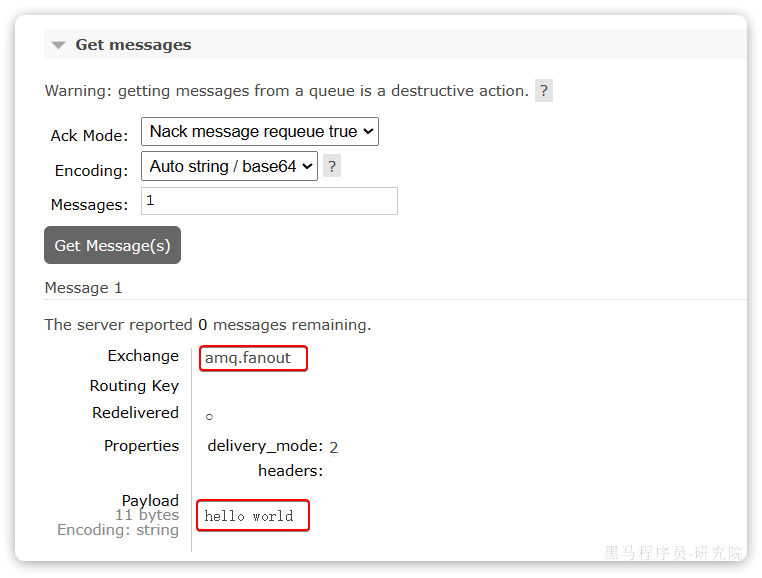 注意,这里我们先不要给这个队列添加消费者,我们要查看消息体的格式。