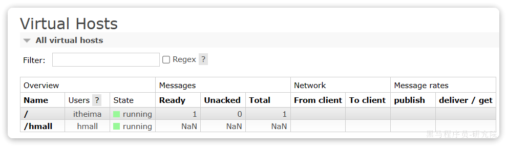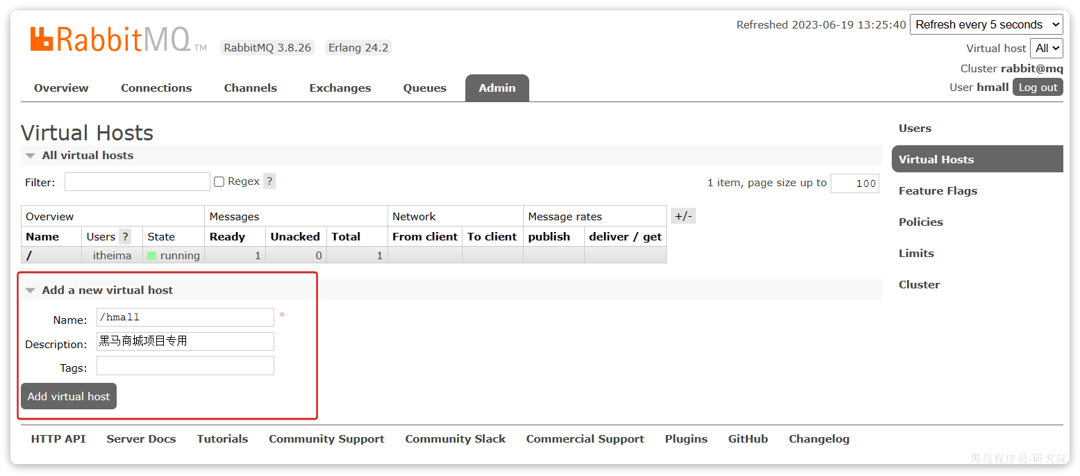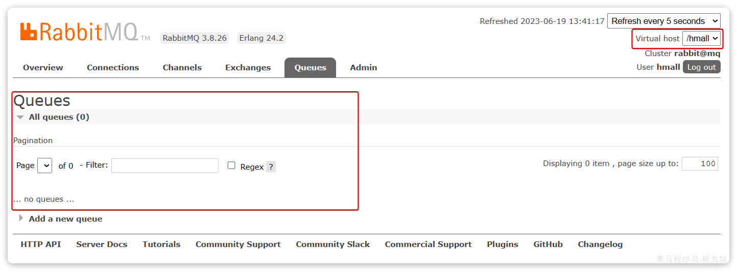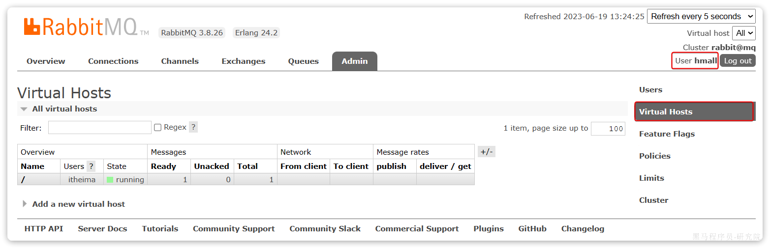 此时,点击页面右上角的virtual host下拉菜单,切换virtual host为 /hmall: