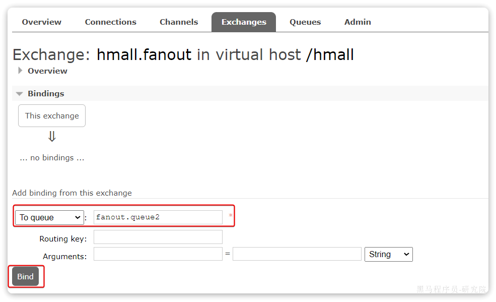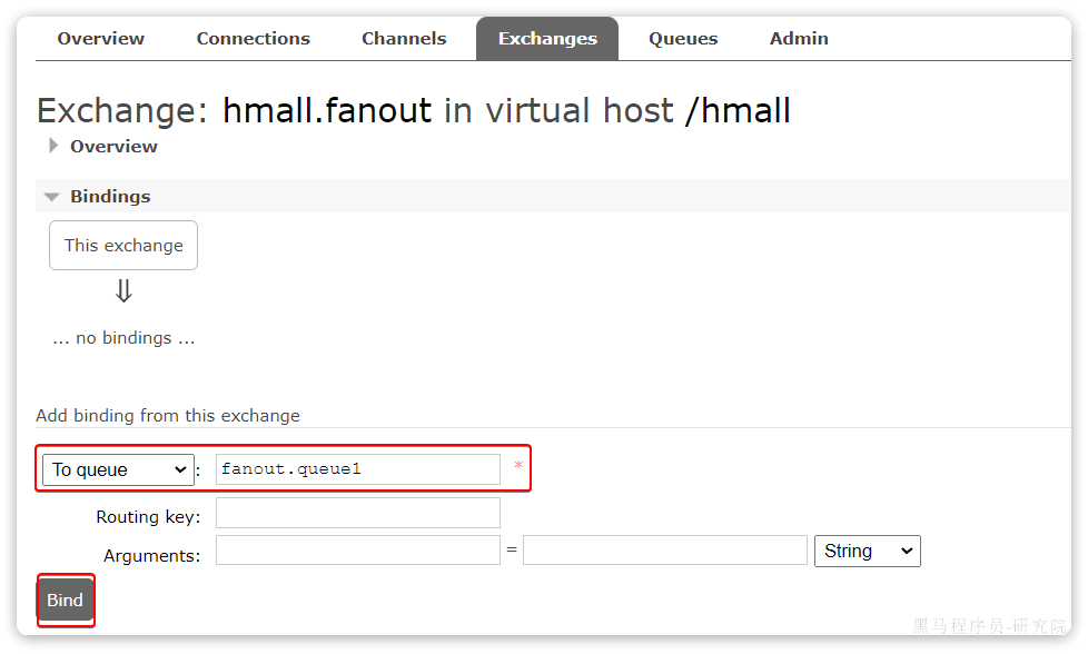 点击Exchanges选项卡,点击amq.fanout交换机,进入交换机详情页,然后点击Bindings菜单,在表单中填写要绑定的队列名称: