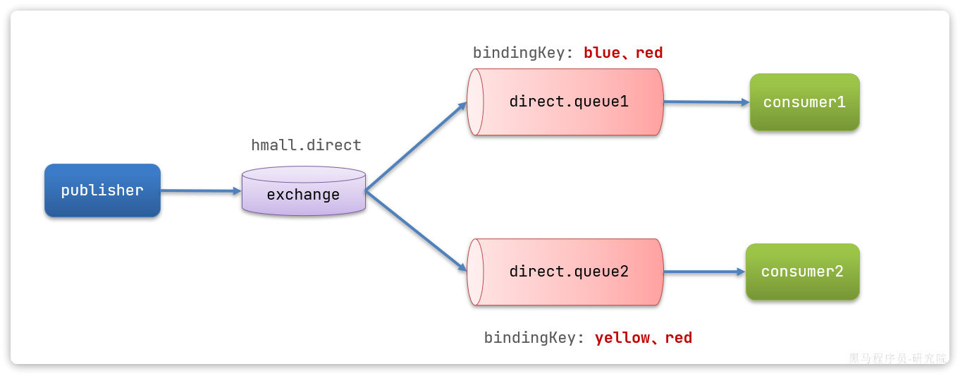 return BindingBuilder.bind(directQueue2).to(directExchange).with("red");