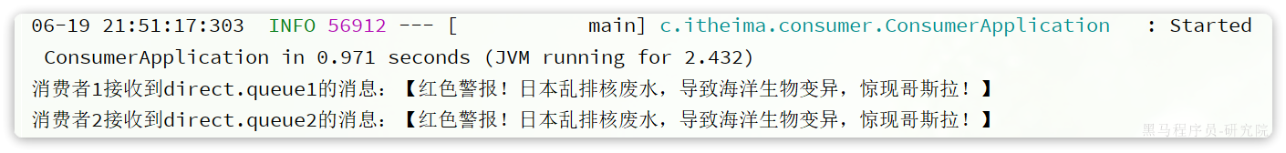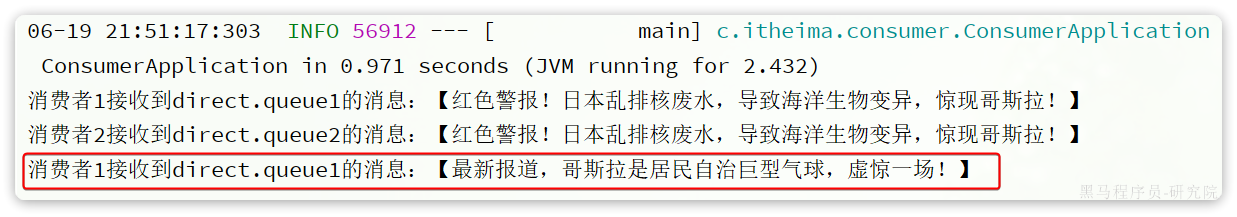 这个时候如果有消费者监听了MQ的hello.queue1或hello.queue2队列,自然就能接收到消息了。