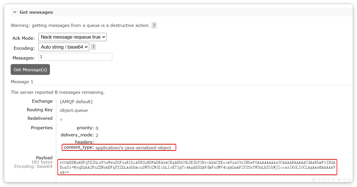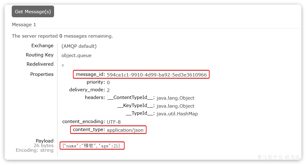 此时,我们到MQ控制台删除object.queue中的旧的消息。然后再次执行刚才的消息发送的代码,到MQ的控制台查看消息结构: