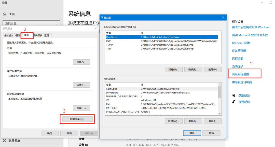 1.右键此电脑->属性->高级系统设置->高级->环境变量: