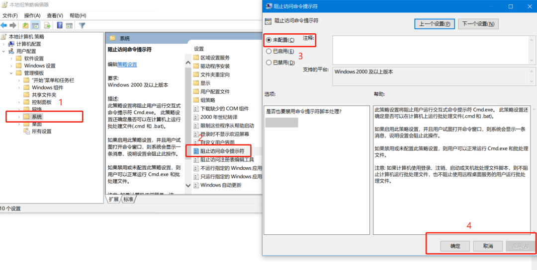 2.进入以下路径:用户配置->管理模板->系统->阻止访问命令提示符,双击打开,勾选未配置,然后右下角点应用-确定: