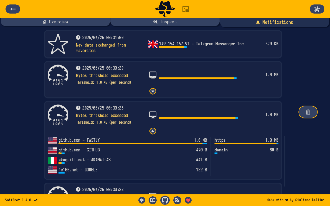 更多详细的安装方式大家可以去项目主页查看! 四、总结Sniffnet 作为一款免费开源的跨平台网络流量监控工具,凭借其直观的界面和丰富的功能,让用户能够轻松掌握网络流量状况。 无论是普通用户想要了解自己的网络使用情况,还是有一定技术知识的用户进行网络问题排查,Sniffnet 都能提供有力的支持。 阅读原文:原文链接 该文章在 2025/8/11 10:18:10 编辑过 |
