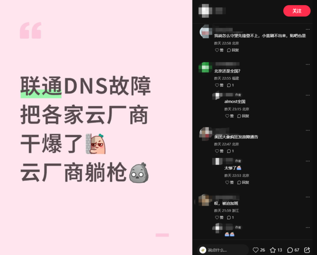 联通DNS污染事件,一场由域名解析故障引发的网络危机。 01 联通网络大面积瘫痪 2025年8月12日晚,北京一位电动车用户在雨中充电,扫码付款时屏幕突然显示网络连接失败。与此同时,公司白领发现抖音、微博无法刷新,餐厅顾客无法用支付宝结账——无数人反复开关手机,却未意识到一场区域性网络瘫痪正在蔓延,这已是24小时内北京地区第二次运营商级DNS故障,前一日移动用户刚经历了类似遭遇。 当夜社交平台涌现用户报告:瑞幸咖啡无法下单、公司OA系统断连、加油站扫码支付失灵。与普通断网不同,微信通话和基础网页浏览却意外畅通——这种选择性故障特征直指DNS污染。用户手机状态栏信号满格,但部分App如同被无形屏障隔离。 阿里云监控系统在19:40捕捉到异常流量,确认联通Local DNS响应异常率达78%。其公告揭示关键证据:递归DNS将合法域名大规模指向127.0.0.2,该IP是本地环回地址的变体,不具备真实服务能力。这解释了为何切换至WiFi或电信网络可临时恢复服务——本质是绕过了故障的联通DNS枢纽。 更棘手的是DNS缓存机制延长了灾难。即使根服务20分钟修复,区域服务器因缓存刷新周期差异(1-48小时不等),贵州、河北等十余个省份用户在次日仍遭遇访问故障。 02 抽丝剥茧,DNS污染的技术原罪 DNS系统如同互联网的“电话簿”,将人类可读的域名(如 www.baidu.com )转换为机器可识别的IP地址(如110.242.68.66)。 而DNS污染则像恶意篡改路标的行为:攻击者通过伪造DNS响应包,将域名指向错误的IP地址。当用户访问被污染的域名时,请求会被引导至无效地址(如127.0.0.2)或黑客控制的服务器。 在联通事件中,攻击者采用了DNS缓存投毒技术:通过向联通Local DNS服务器注入伪造记录,使“微博.com”“抖音.com”等域名被解析到127.0.0.2(本机回环地址的变体)。这种地址如同“数字黑洞”,任何发送至此的数据包都会在本地消失,导致用户访问失败。更隐蔽的是,污染记录会在DNS缓存中存活数小时,持续影响后续用户。 而DNS系统如同互联网的神经传导网络,承担着将“网址”(域名)翻译为“门牌号”(IP)的核心任务。其脆弱性源于三方面技术软肋—— 递归查询链路的单点失效:当用户访问网站时,请求需经本地DNS→递归DNS→根DNS→顶级域DNS→权威DNS的复杂接力。北京联通202.106.46.151等递归DNS节点故障时,如同邮局分拣中心突然瘫痪,导致吉林等依赖该节点的区域集体“失明”。 协议先天缺陷的致命诱惑:DNS基于无连接的UDP协议传输,源IP极易伪造。攻击者可发动DNS放大攻击,伪造受害者IP向公共DNS发送查询,利用响应报文远大于查询报文的特性,用较小流量制造数倍的攻击洪流。2014年全球根服务器遭遇的污染事件正是利用此漏洞。 缓存投毒的精准狙击:黑客通过向递归DNS注入伪造响应,将银行域名解析到钓鱼网站IP。本次事件虽未发现恶意指向,但127.0.0.2的指向模式揭示可能遭受中间人攻击或服务器篡改。山东联通2015年瘫痪事故分析报告曾明确指出:DNS服务器被“黑”是导致省级网络中断的主因。 03 破局DNS污染防御战 在数字化生存已成常态的时代,DNS污染事件如同突然被拔掉的氧气面罩,警醒我们网络基础设施的防御体系亟待重构。 面对愈加精密的攻击手段,运营商和科技公司正推动着一场静默的技术革命——从被动应急的亡羊补牢转向主动免疫的系统重塑,这场防御突围的核心在于为互联网的“导航罗盘”铸造三重护盾。 技术进化的第一道防线在加密层展开。传统DNS协议像明信片般在互联网裸奔,查询请求与响应以明文传输,让中间人攻击者轻易完成“狸猫换太子”。现在,DNS over HTTPS(DoH)和DNS over TLS(DoT)两种加密协议如同为数字信封加上密码锁。 当用户键入域名查询时,这些加密技术将请求封装在HTTPS流量中,就像把地图藏在防弹运输车内。火狐浏览器已实现DoH自动切换功能,用户在不知觉间就能规避区域DNS拦截。而在移动运营商层面,中国电信2024年率先启用的DoT试验组网显示,部署该协议的网络节点成功阻断了97%的DNS篡改尝试。 更为深刻的变革是网络基础设施的重构。本次联通事件暴露出单点污染的“核爆效应”——一个市级DNS节点被攻陷便波及整个服务区。作为应对,运营商正推进本地缓存服务器的分布式部署,配合CDN节点建立蜂窝状防护网。 同时,污染监控系统如同网络安全的气象雷达,阿里云搭建的实时监测平台能对异常解析请求进行毫秒级响应。在8月12日事件中,该系统正是通过识别127.0.0.2这一异常解析结果的集中爆发,在8分钟内就溯源到受污染节点坐标。 普通用户在防御生态中并非被动角色。当灾难发生时,将设备DNS服务器切换至Cloudflare(1.1.1.1)或腾讯DNSPod(119.29.29.29)等具有抗污染能力的公共DNS服务,相当于紧急启用备用导航系统。 技术爱好者还可在路由器设置中启用DNSSEC验证选项,或在终端使用dig/nslookup工具定期检验关键域名的解析健康度。这些手段如同数字时代的应急包储备——平时隐于后台,危机时却能成为救命绳索。 04 藏在DNS污染背后的国域安全危机 当前全球互联网命脉被13台根域名服务器牢牢掌控,而其地理分布折射出令人警惕的战略失衡——美国独占10台,日本、荷兰、瑞典各驻守1台,中国境内至今未能拥有任何根服务器资源。这种高度集中的格局使我国域名系统暴露于三重安全威胁之下。 若极端军事冲突发生,部署在特定国家的根服