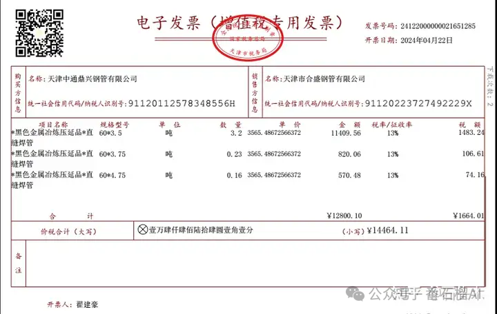 {    "msgCode": 200,    "msg": "返回成功!",    "code": null,    "number": "24122000000021651285",    "date": "2024年04月22日",    "checksum": null,    "totalAmount": 14464.11,    "totalAmountString": "壹万肆仟肆佰陆拾肆圆壹角壹分",    "taxAmount": 1664.01,    "amount": 12800.10,    "buyerName": "天津中通鼎兴钢管有限公司",    "buyerCode": "91120112578348556H",    "buyerAddress": null,    "buyerAccount": null,    "sellerName": "天津市合盛钢管有限公司",    "sellerCode": "91120223727492229X",    "sellerAddress": null,    "sellerAccount": null,    "type": "增值税专用发票",    "detailList": [        {            "name": "*黑色金属冶炼压延品*直缝焊管",            "model": "60*3.5",            "unit": "吨",            "count": 3.2,            "price": 3565.48672566372,            "amount": 11409.56,            "taxRate": 0.13,            "taxAmount": 1483.24        },        {            "name": "*黑色金属冶炼压延品*直缝焊管",            "model": "60*3.75",            "unit": "吨",            "count": 0.23,            "price": 3565.48672566372,            "amount": 820.06,            "taxRate": 0.13,            "taxAmount": 106.61        },        {            "name": "*黑色金属冶炼压延品*直缝焊管",            "model": "60*4.75",            "unit": "吨",            "count": 0.16,            "price": 3565.48672566372,            "amount": 570.48,            "taxRate": 0.13,            "taxAmount": 74.16        }    ]}